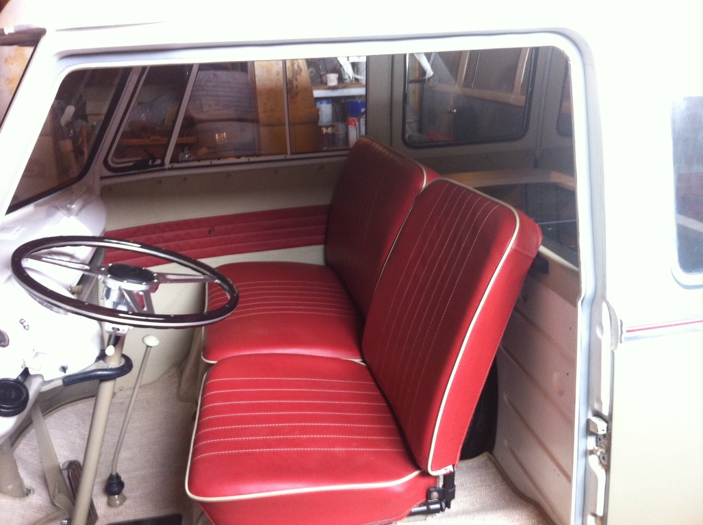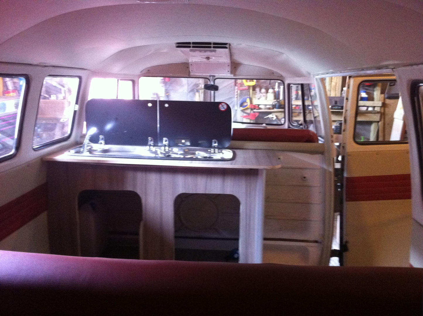 Consisting of front split bench, all door cards and full width rock and roll bed have been finished in a 2 tone red and cream to compliment the exterior.